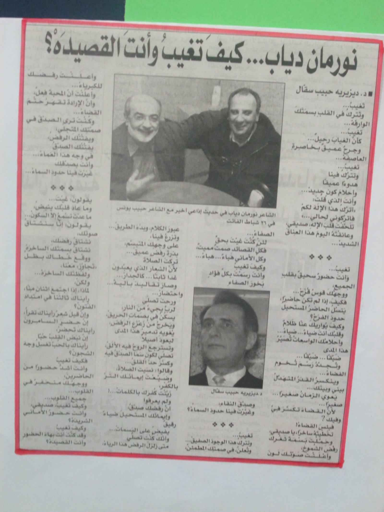 بعد وفاته، كتب فيه الدكتور ديزيره سقال قصيدة “الغائب” التي نشرتها جريدة “الأنوار” بتاريخ 14 آب 2014، وهذا نصّها كما وردت في صفحة الجريدة: