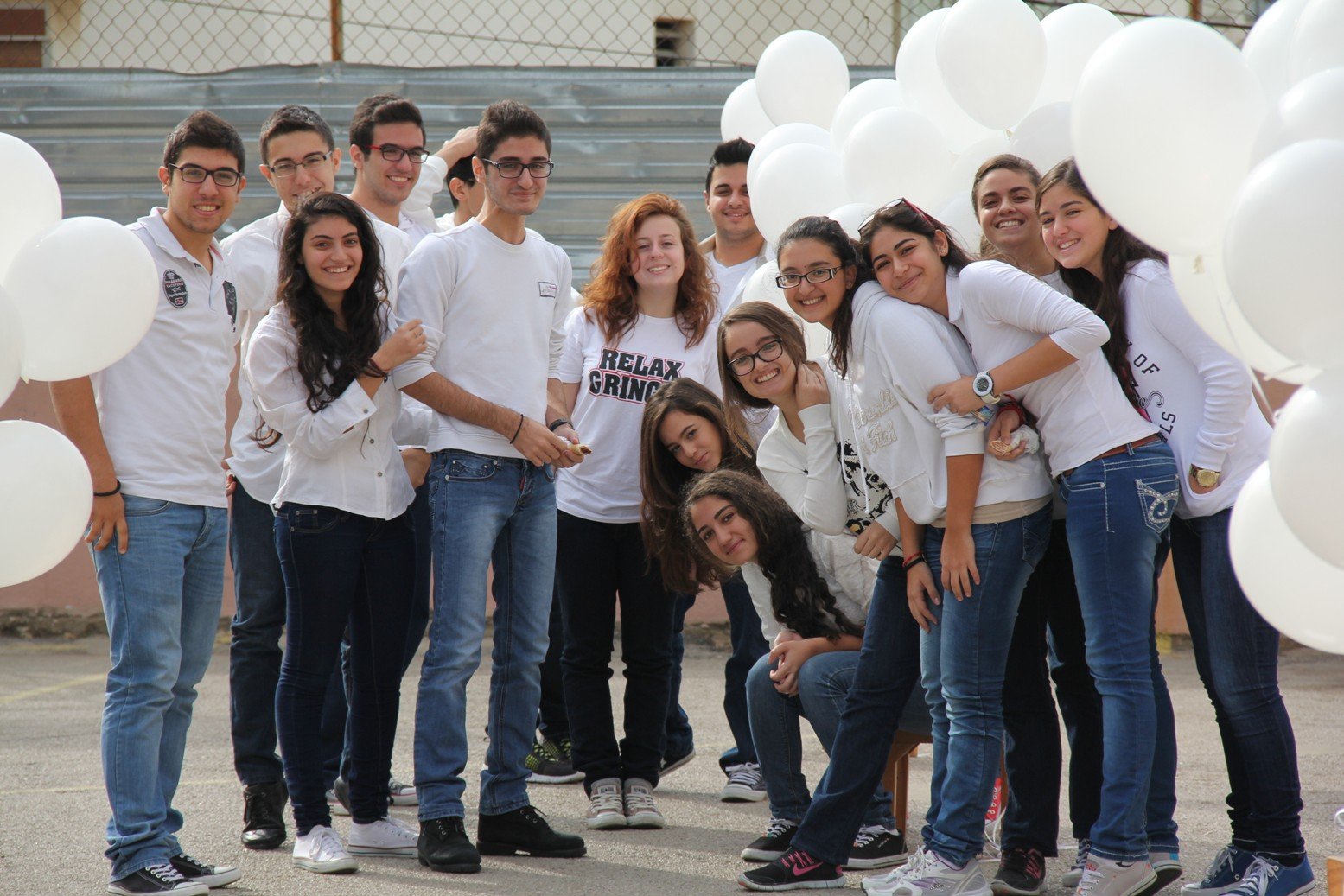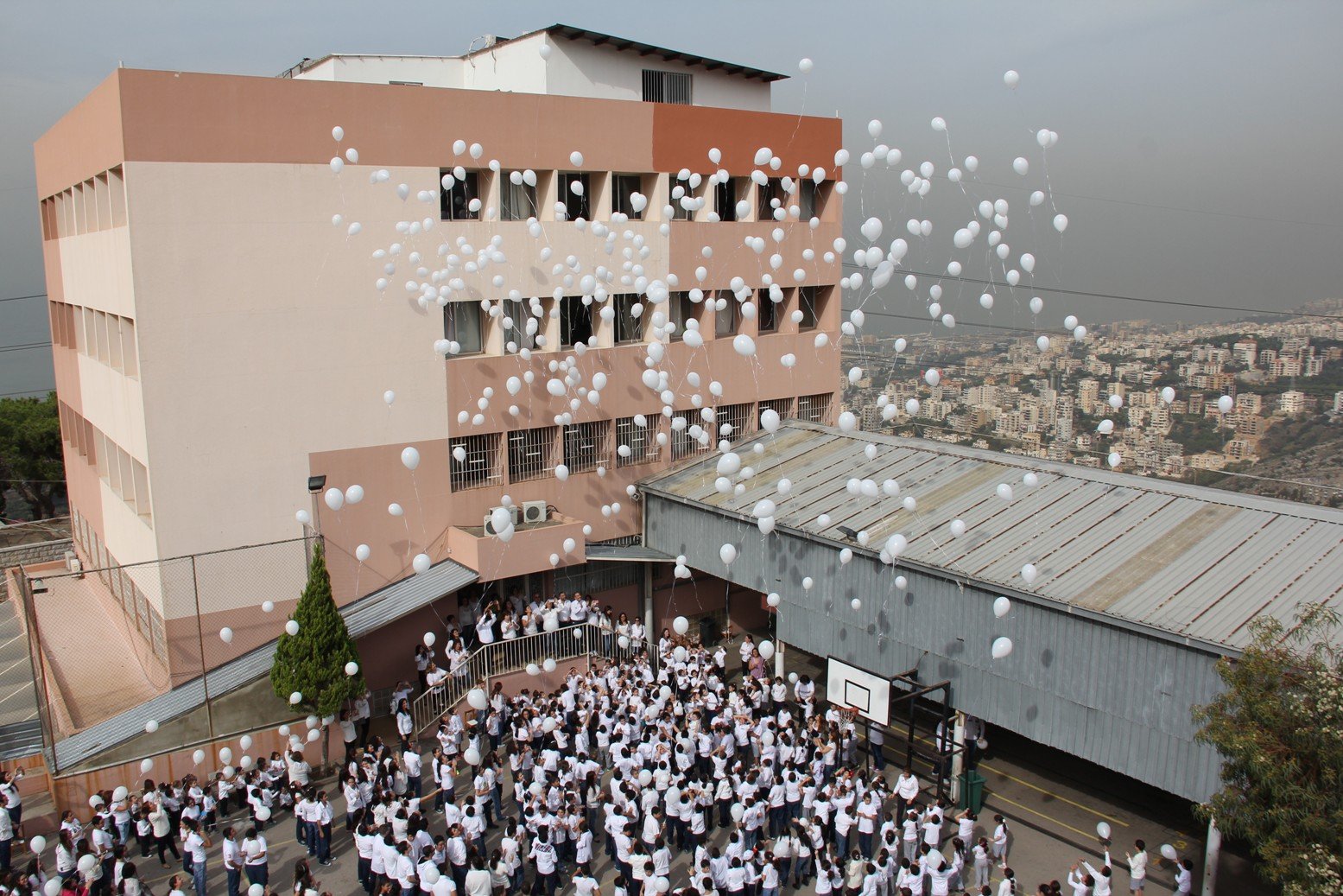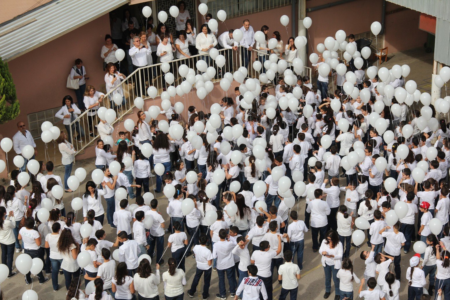 les élèves, le corps enseignant ainsi que le corps administratif, tout de blanc vêtus, ont lâché des centaines de ballons blancs dans la cour durant la récréation.