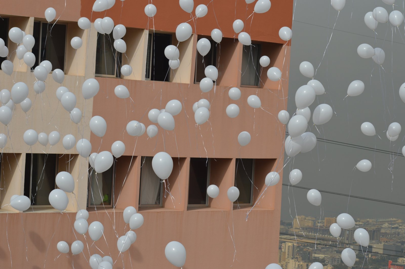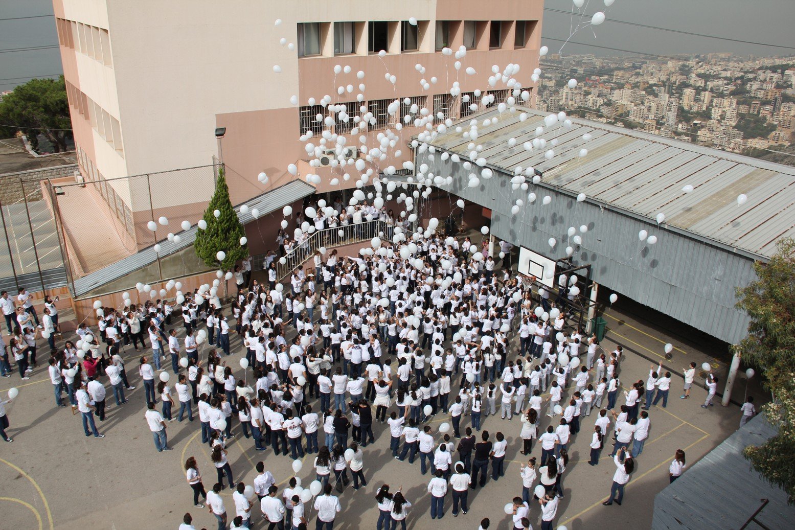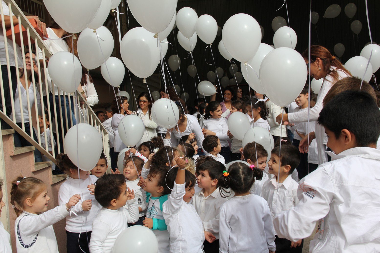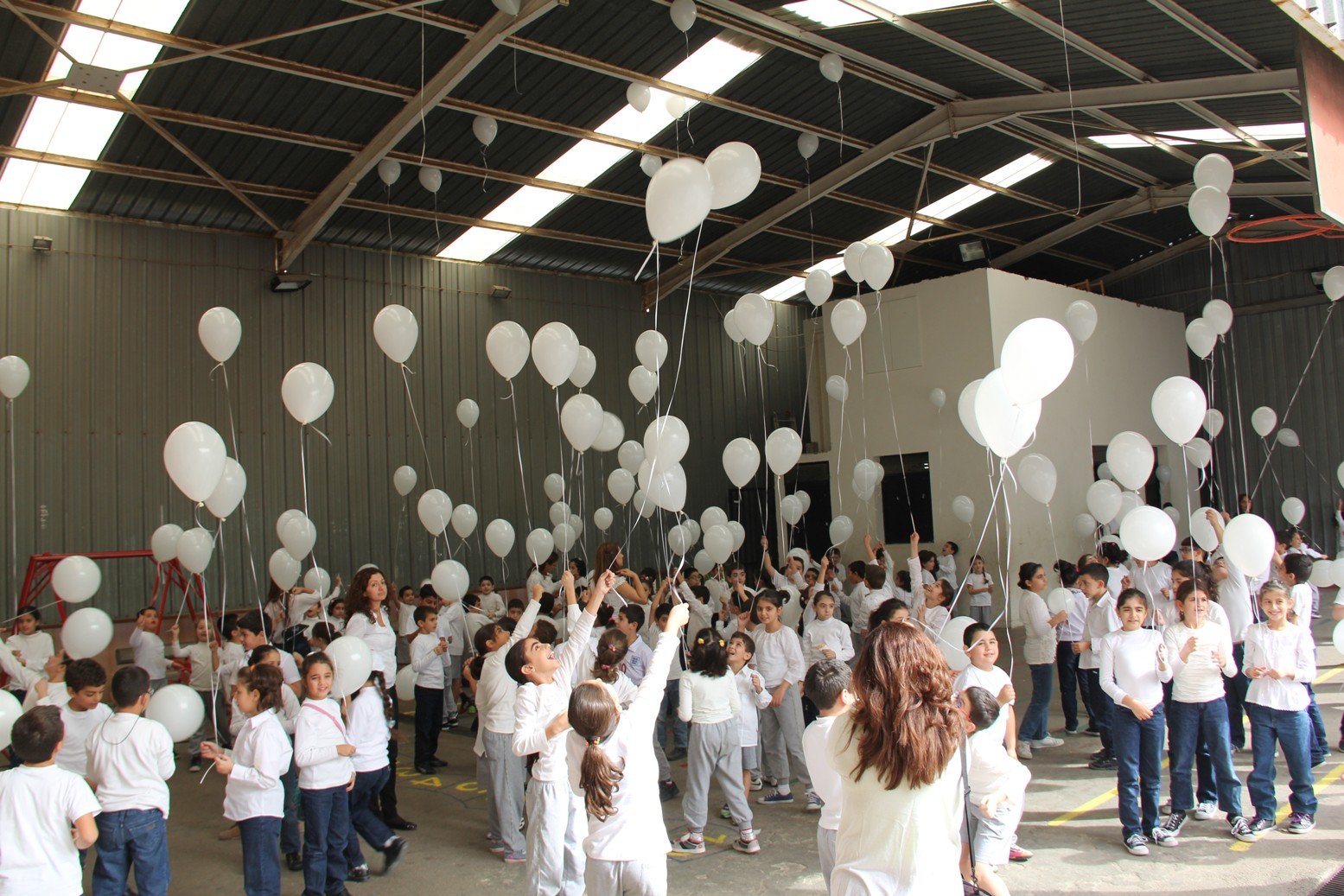 les élèves, le corps enseignant ainsi que le corps administratif, tout de blanc vêtus, ont lâché des centaines de ballons blancs dans la cour durant la récréation.
