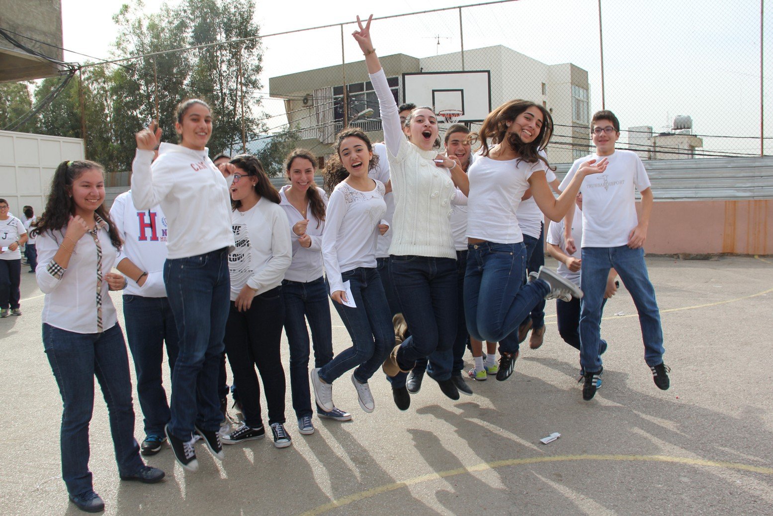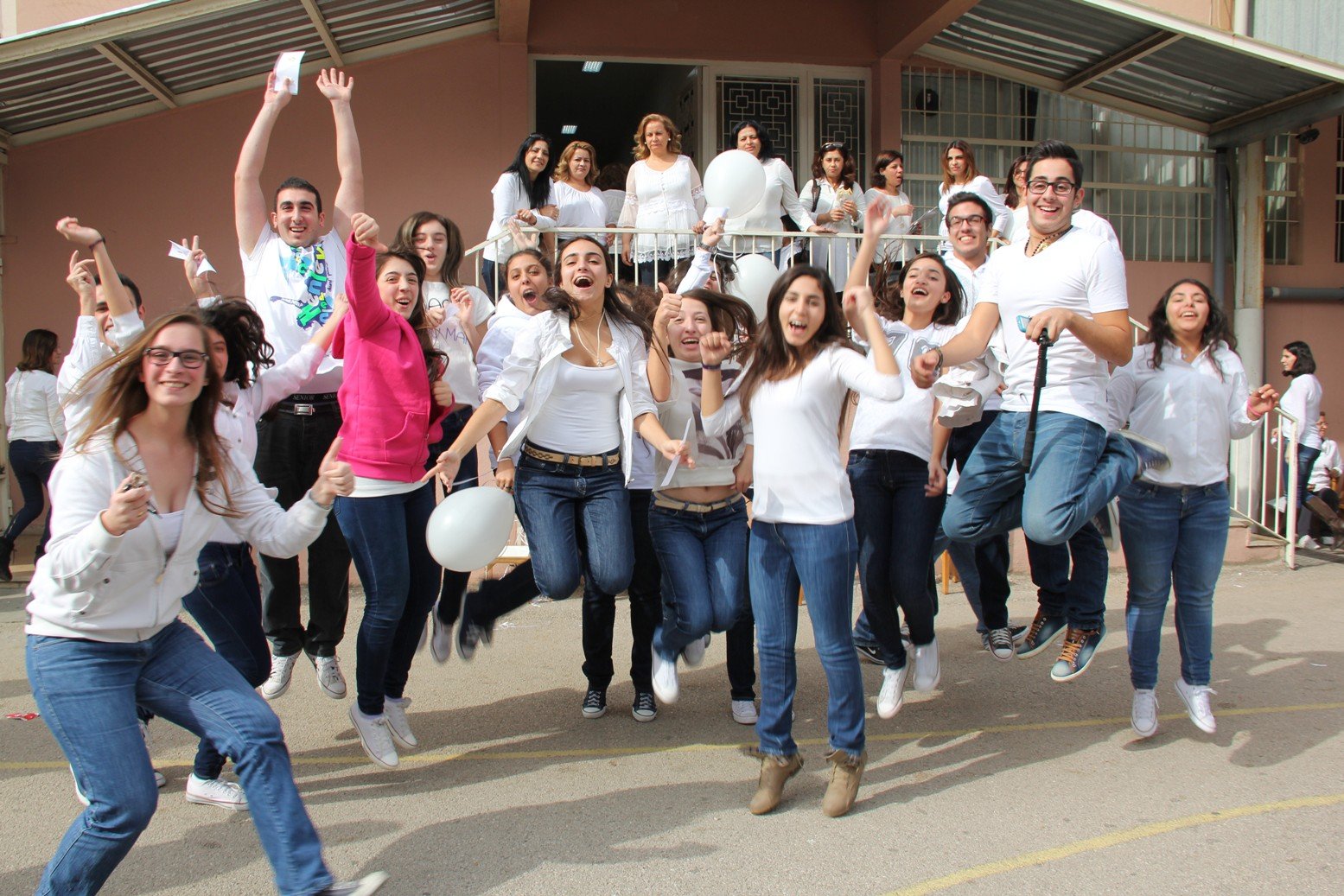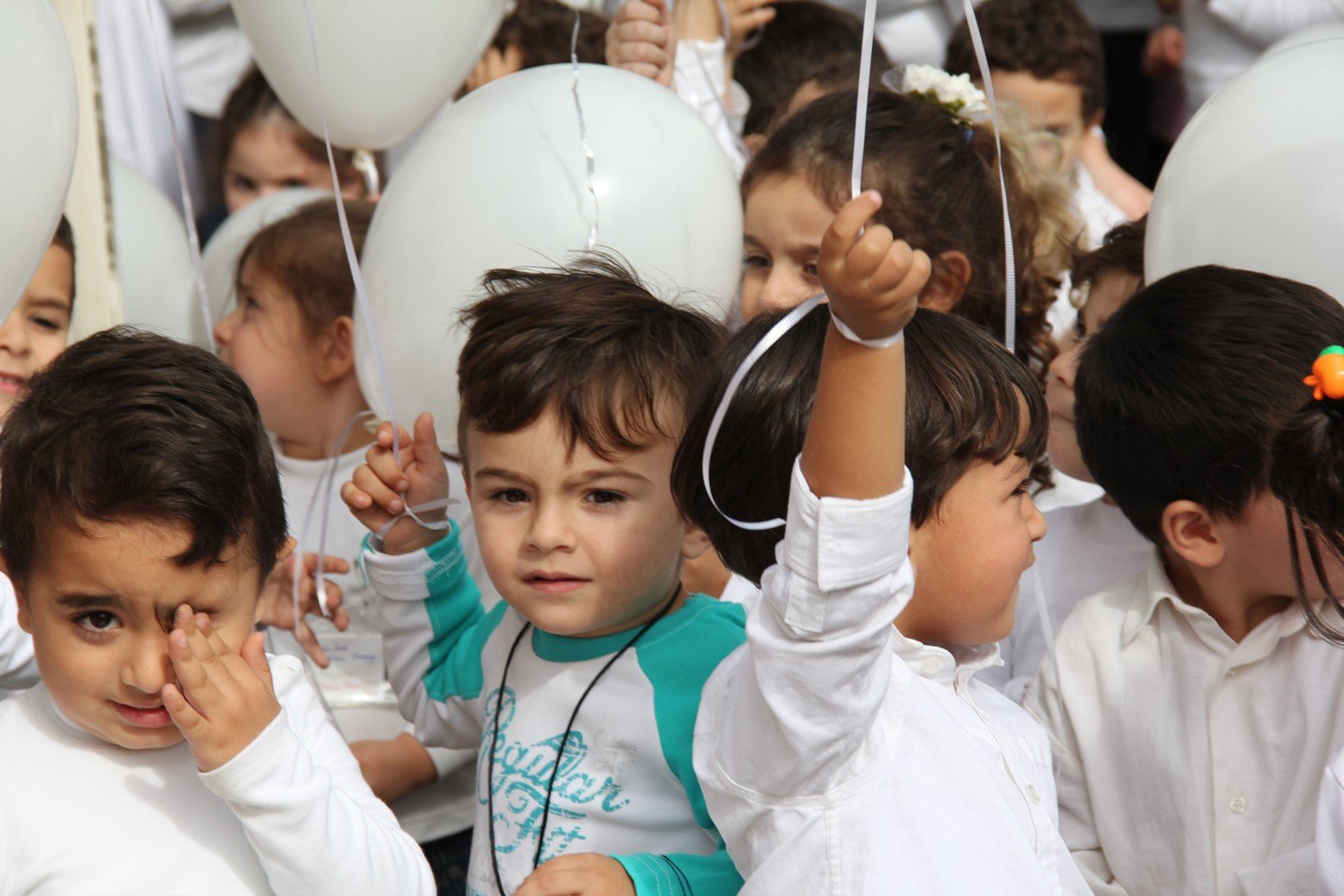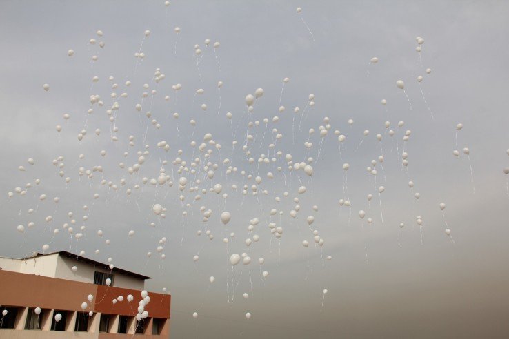 les élèves, le corps enseignant ainsi que le corps administratif, tout de blanc vêtus, ont lâché des centaines de ballons blancs dans la cour durant la récréation.
